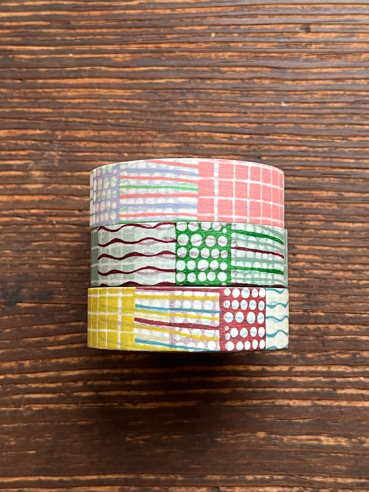 サイズ:15mm×15m 素材:和紙 デザイン:関美穂子 画像中、上から、なたね、うす紅、ねずみ、となります。